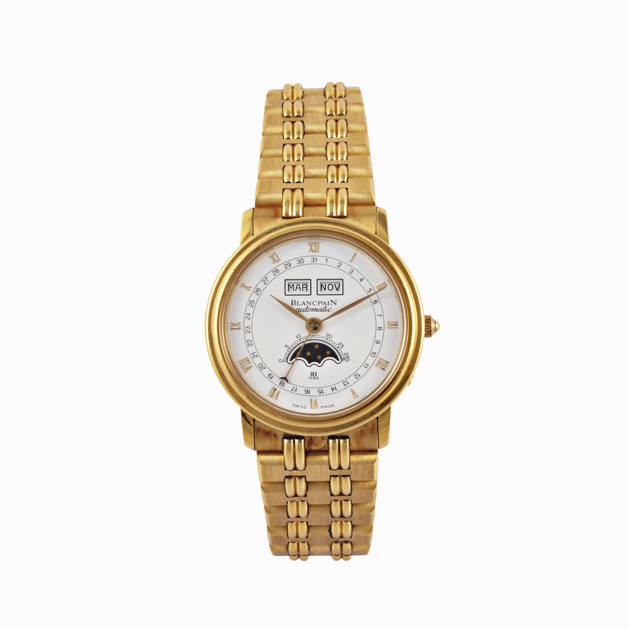 Quadrante: Bianco, numeri Romani, con triplo calendario e fasi lunari. Sfere a foglia in oro
