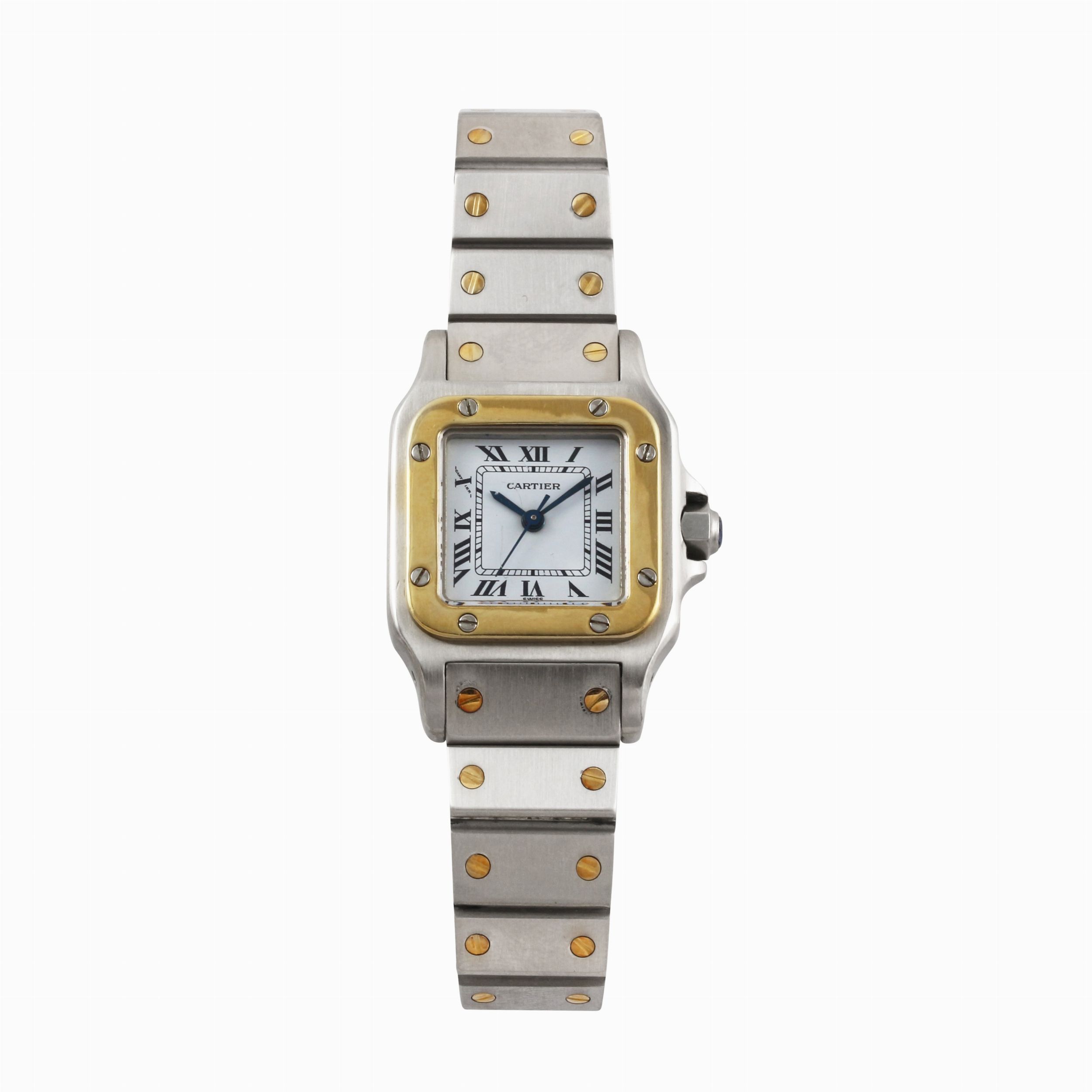 Ref: SantosCassa: in acciaio e oro, fondello serrato da viti. Vetro zaffiroQuadrante: bianco, numeri Romani. Sfere EpeeMovimento: automaticoBracciale: originaleLunghezza complessiva bracciale: 150 mmAnno: 1980 circaDIM: 26 x 34 mm