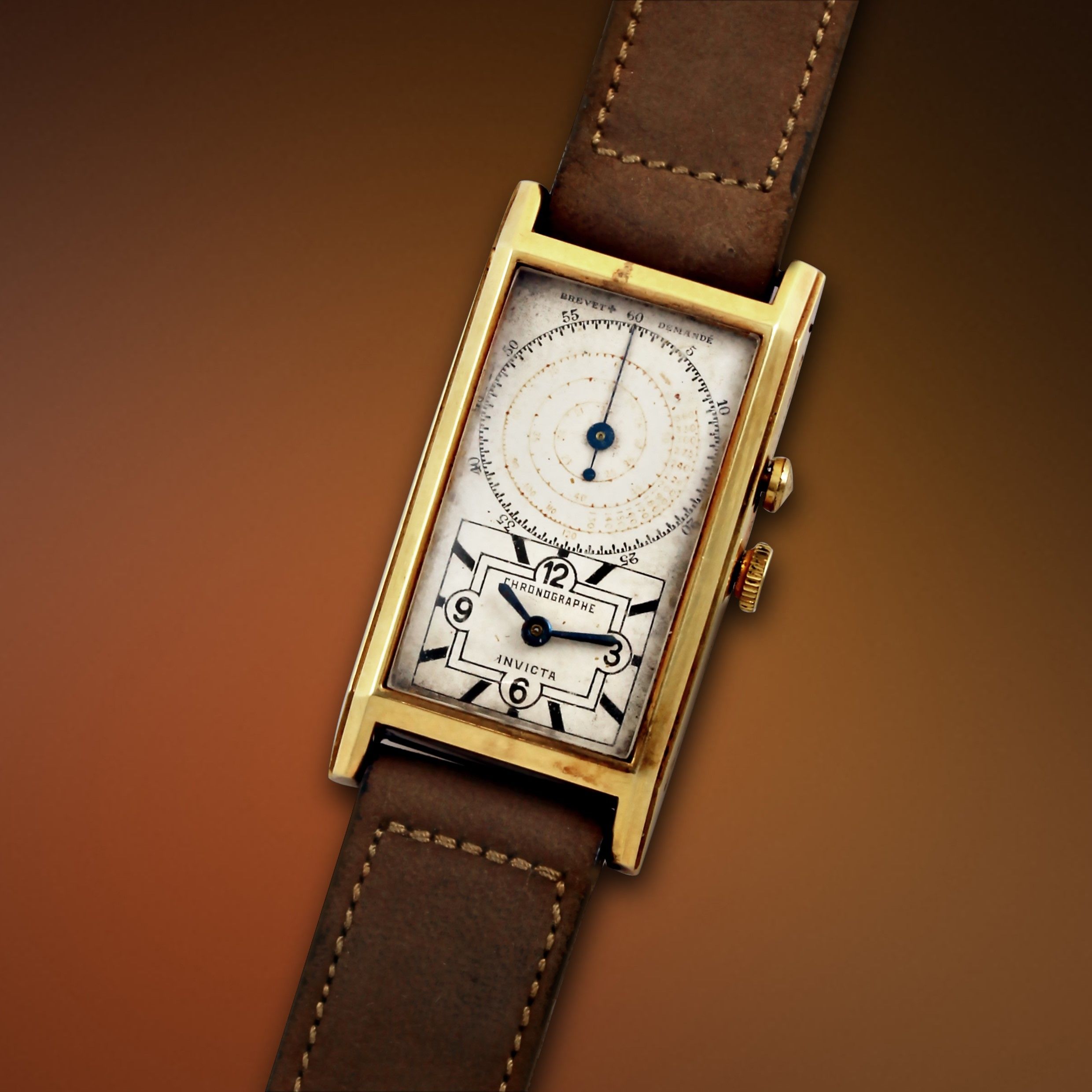 Cassa: in oro giallo 18K, di forma rettangolare, pulsante a slitta per cronografo, fondello a pressione