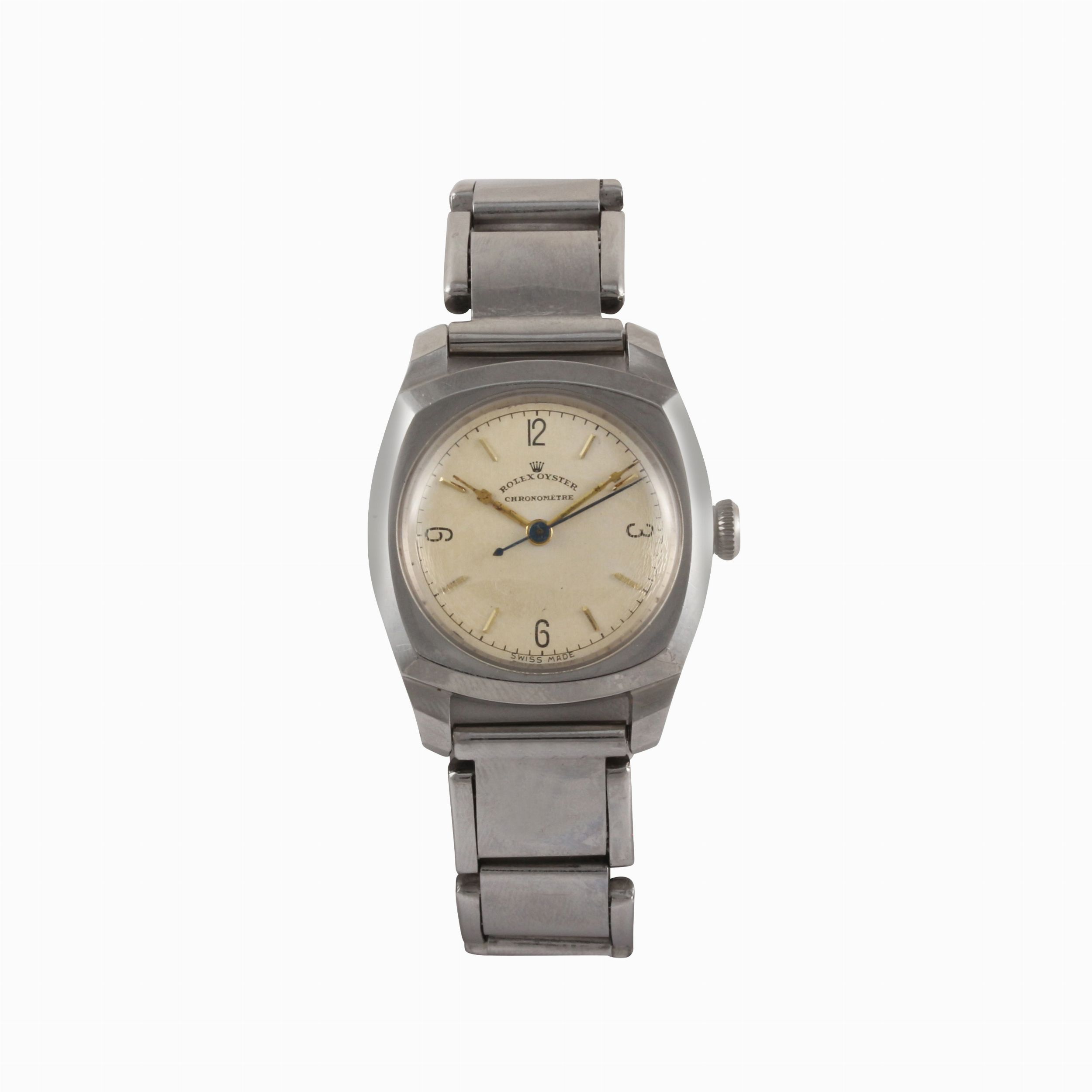 Quadrante: argento, numeri arabi e indici a bastone. Sfere Holly