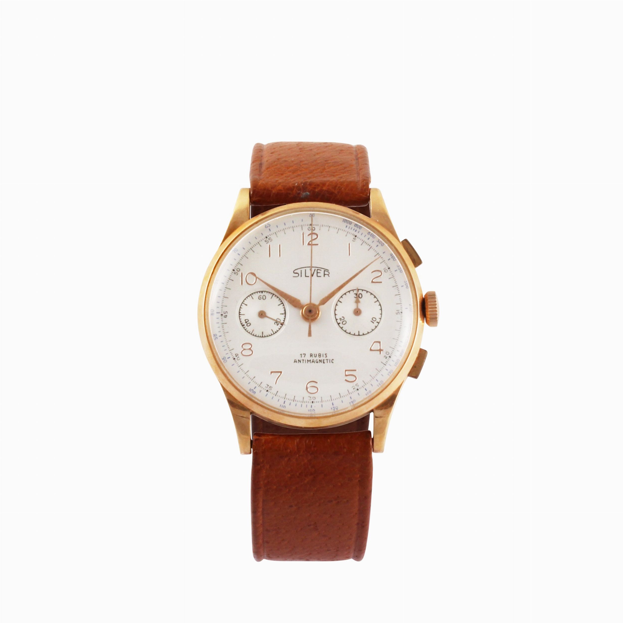 Ref: 1750Cassa: in oro giallo 18K, fondello a pressioneQuadrante: argento, numeri arabi, contatori ausiliari per i secondi e 30 minuti. Sfere AlphaMovimento: manualeAnno: 1960 circaDIAM: 37 mmNota: in ottime condizioni