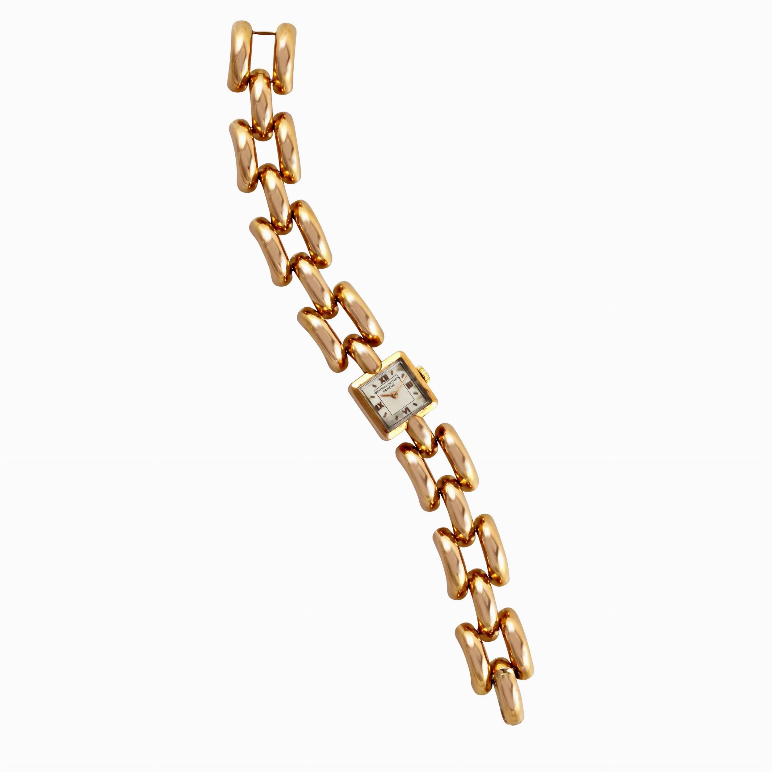 Cassa: in oro giallo 18K, fondello a pressioneQuadrante: argento, numeri Romani. Sfere a bastoneMovimento: manualeBracciale: originale in oroAnno: 1940DIM: 17 x 17 mm