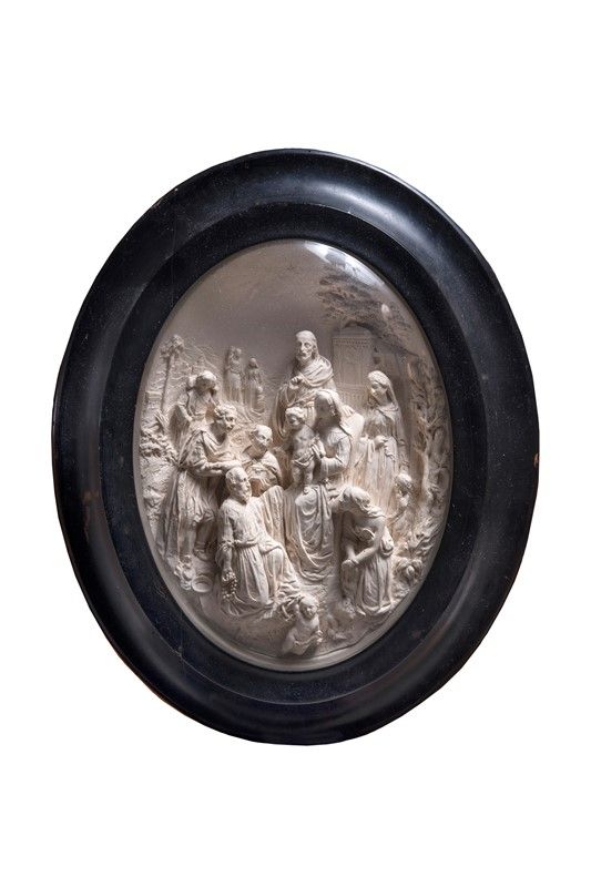 Ovale in gesso a basso e altorilievo. mm 300x225. Opera accademica che si ispira alla grande tradizione scultorea, replica di altra di identico soggetto e di identiche dimensioni conservata presso il Museo della Basilica di San Domenico a Bologna (catalogo generale dei Beni culturali codice n. 0800025077). Nella versione conservata a Bologna si legge in basso sull'ovale un'iscrizione che nella scheda della Soprintendenza è stata letta come "Dossenel"; altrimenti nelle intenzioni del vecchio catalogatore da riferire forse ad Alceo Dossena (Cremona, 1878 – Roma, 1937).