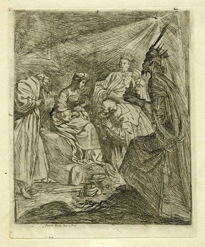 Acquaforte. mm 260x211. Foglio: mm 284x241. Robert-Dumesnil, 2. Bellini (Testa), 50. Pacht Bassani, 36. Al margine inferiore verso sinistra "Pietro testa Inv. e fece". L'incisione venne stata realizzata durante il primo soggiorno di Vignon a Roma e nel I stato si presenta firmata al rovescio e datata 1619 sulla lastra. Successivamente venne erroneamente attribuita a Pietro Testa, il nome di Vignon e la data furono cancellati e sostituiti da “Pietro Testa Inv. e fece” come nel presente esemplare che ne rappresenta il II stato. Tiratura tarda su carta bianca non vergellata.