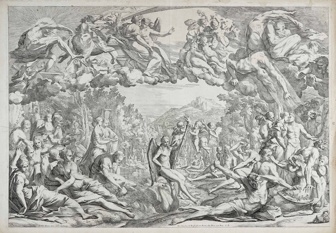 Acquaforte e puntasecca. mm 497x715. Foglio: mm 530x760. Bartsch, XX, 36. Bellini (Testa), 30. Cropper, 75. Sulla lastra in basso a sinistra "Pietro Testa inve. delin. et Sculp." e al centro indirizzo di Giovan Giacono De Rossi. Bellissima impressione nel II e definitivo stato dopo la rielaborazione della lastra e la comparsa della firma dell'autore e dell'indirizzo di De Rossi. Carta vergellata spessa con filigrana "fiore di giglio in cerchio singolo".