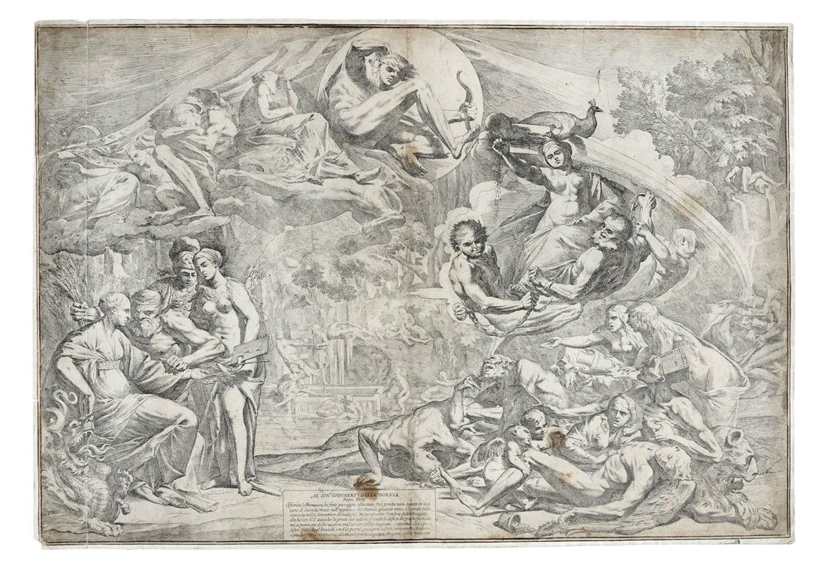 Acquaforte. mm 485x708. Foglio: mm 500x720. Bartsch, XX, 37. Bellini (Testa), 31. Cropper, 76. Buona prova nel II stato di 3 con la dedica a Giovanni della Bornia in basso al centro e prima della frattura della lastra al margine destro. Carta vergellata spessa. Al verso marchio di collezione a inchiostro rosso (non su Lugt) e nota inventariale a penna e inchiostro bruno con il numero "102".