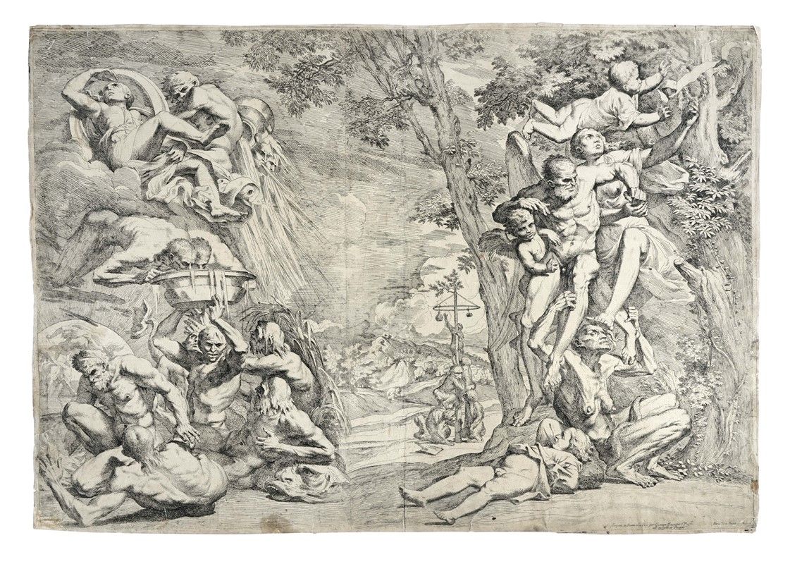 Acquaforte. mm 492x703. Foglio: mm 500x717. Bartsch, XX, 39. Bellini (Testa), 28. Cropper, 81/82. Con la firma in basso a destra sulla lastra e la data "1644". Buona prova nel II stato di 3, dopo la comparsa dell'indirizzo di Giovan Giacomo De Rossi e prima della sostiruzione con quello di Giovan Domenico. Carta vergellata spessa con filigrana "scudo con figura inginocchiata"(?).