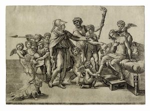 1531-1550. Bulino. mm 77x54. Bartsch, VIII, 151. Hollstein, 152. Con il monogramma sulla tavoletta in basso [..]