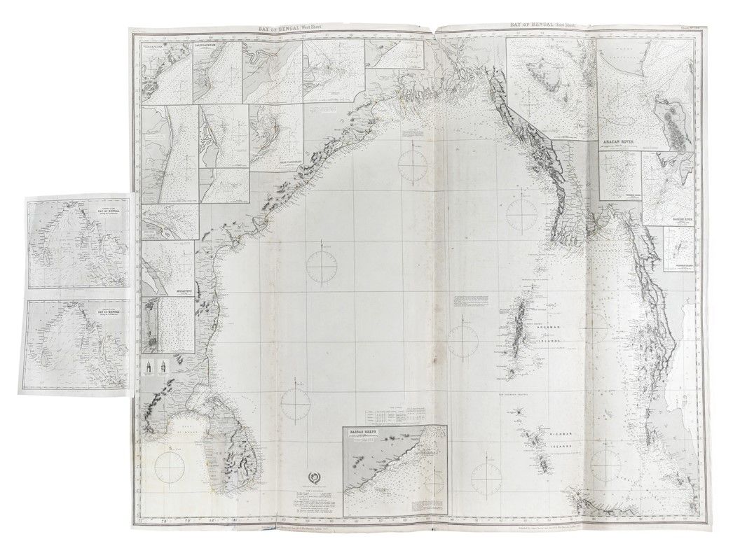 Incisione in acciaio. mm 1085x1260 (1515). Grande carta nautica blue-back del Golfo del Bengala e dintorni, pubblicata per la prima volta nel 1864 da James Imray. La mappa riporta la parte settentrionale di Sumatra, le Isole Andamane, Ceylon (l'attuale Sri Lanka), lo Stretto di Malacca, le Isole Nicobare, Coromandel, Circars Orissa, Chittagong, Aracan e parte della penisola malese. Presenta 18 riquadri, tra cui The Bay and Harbour of Trincomalie, River Mutlah, Preparis Island, Bassein River, Aracan River, Point De Galle Harbour, Bassas Reefs, Colombo. A sinistra, si trova un foglio (mm 420x280) con indicazione delle direzioni delle correnti marine durante il periodo dei monsoni.