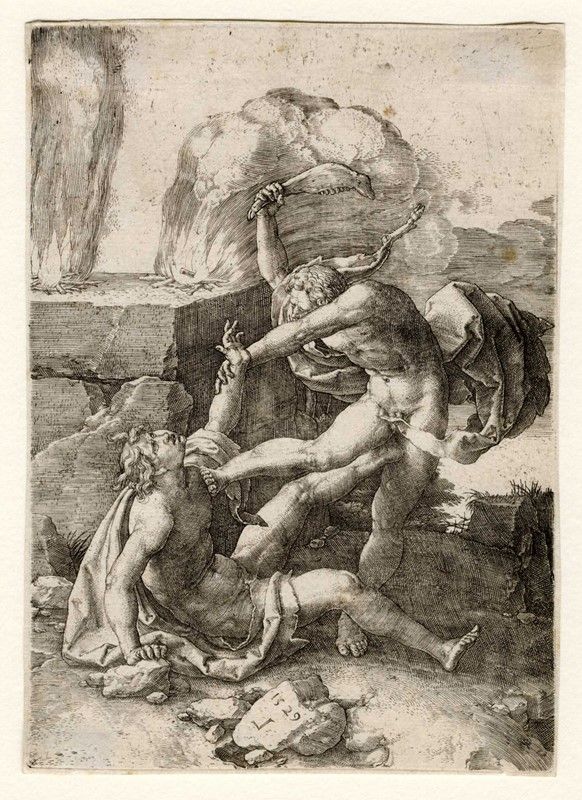 Bulino. mm 163x115. Foglio: mm 166x119. Bartsch, VII, 5. New Hollstein, 5. Con il monogramma in controparte e la data "1529" sulla pietra in basso al centro. Quinta tavola da La storia di Adamo ed Eva, serie in sei fogli tutti datati "1529". Ottima prova nella variante a-b/c del I stato di 3, su carta vergellata sottile con filigrana "P gotico sormontato da trifoglio".