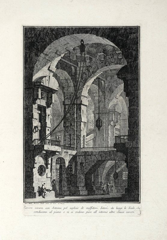 Acquaforte. mm 384x237. Foglio: mm 505x352. Ficacci, 4. Da Prima parte di architetture e prospettive inventate ed incise da Gio. Batta Piranesi architetto veneziano dedicate al sig. Nicola Giobbe, opera composta da frontespizio e 12 tavole pubblicata per la prima volta a Roma dai fratelli Pagliarini nel 1743 e di nuovo in Opere varie da Bouchard nel 1750 con due tavole aggiuntive e il titolo cambiato. Nell'edizione Bouchard vengono aggiunte in basso legende in rame con numerazione araba all'angolo a destra. Bellissima prova dall'edizione Bouchard, stampata con evidenza di segno su carta vergellata pesante priva di filigrana.