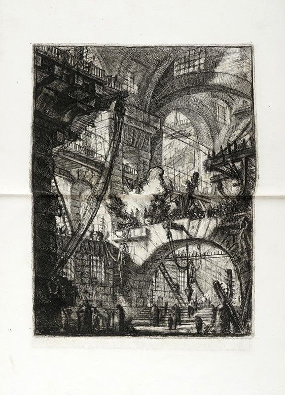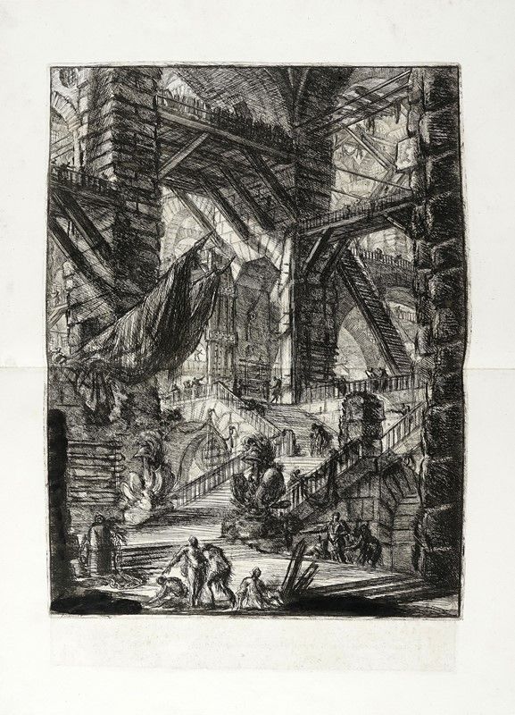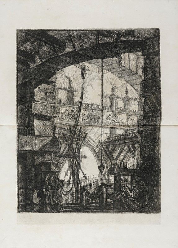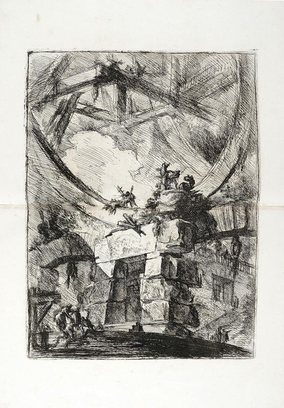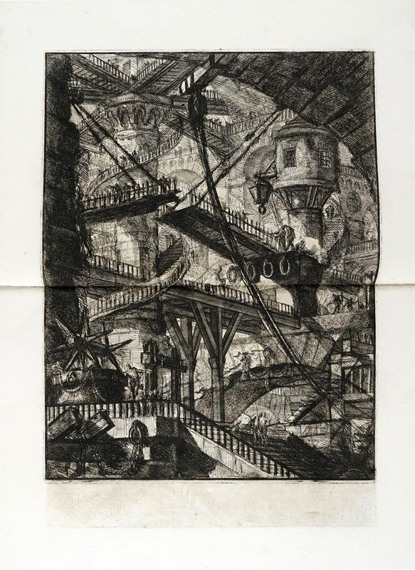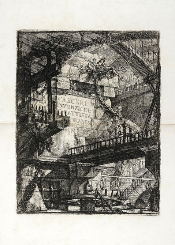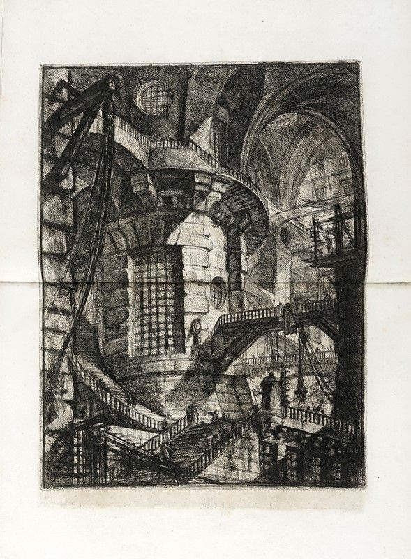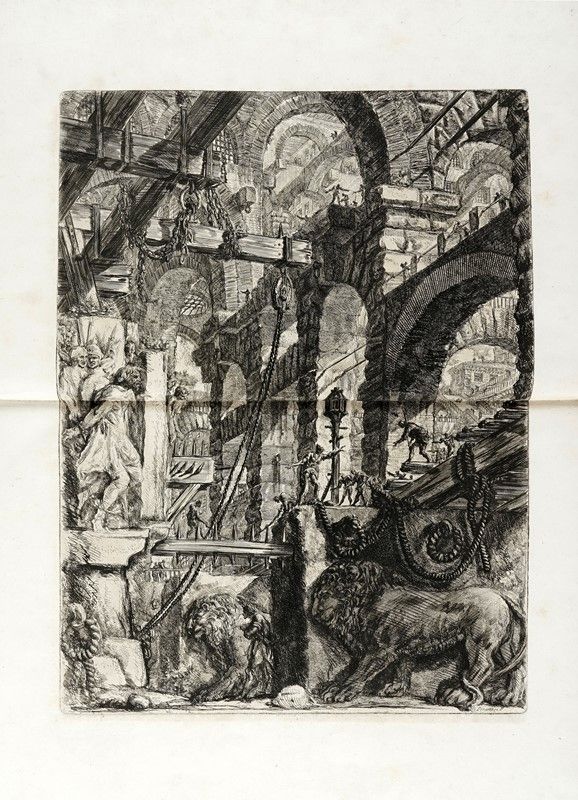 In-folio grande (mm 550x410). Frontespizio e 15 tavole incise all'acquaforte, bulino, morsura aperta, brunitoio, raschietto. mm 540/565x412/420. Foglio: mm 765x540/542. Tavole rilegate con brachetta cartacea al centro nell'ordine seguente: Frontespizio. Hind, 1. Robison, 29. V/IX; L’uomo sulla cremagliera. Hind, 2. Robison, 43. II/VI; La torre rotonda. Hind, 3. Robison, 30. II/VI; La piazza grande. Hind, 4. Robison, 31. II/VI; Il bassorilievo con i leoni. Hind, 5. Robison, 44. I/III; Il fuoco fumante. Hind, 6. Robison, 32. II/VII; Il ponte levatoio. Hind, 7. Robison, 33. II/VI; La scalinata con i trofei. Hind, 8. Robison, 34. II/VI; La ruota gigante. Hind, 9. Robison, 35. IV/VIII; Prigionieri su una piattaforma sporgente. Hind, 10. Robison, 36. II/VI; L’arco con ornamento a conchiglia. Hind, 11. Robison, 37. III/VII; Il cavalletto. Hind, 12. Robison, 38. III/VI; L’arco gotico. Hind, 14. Robison, 40. III/VI; Il molo con la lampada. Hind, 15. Robison, 41. III/VII; Il pozzo. Hind, 13. Robison, 39. II/VI; Il molo con le catene. Hind, 16. Robison, 42. II/VI con il numero XVI all’angolo in basso a destra. Esemplare in II edizione dopo l'aggiunta della firma al margine inferiore di ogni tavola ma prima della numerazione romana all'angolo in alto. Splendide prove di grande freschezza stampate con inchiostrazione piena su carta vergellata spessa con filigrana fiore di giglio in doppio cerchio con lettere B e V (Robison, 32, 1756-1761, come segnalato per questa edizione) visibile su gran parte dei fogli. Legatura moderna in carta decorata di colore viola, al piatto anteriore etichetta per il titolo in pelle nera con impressioni in oro, tagli di testa dorati. Al contropiatto etichetta di provenienza della libreria antiquaria Carl Ewald Rappaport di Roma.