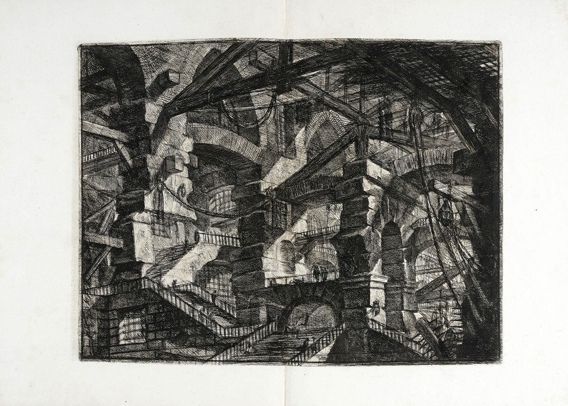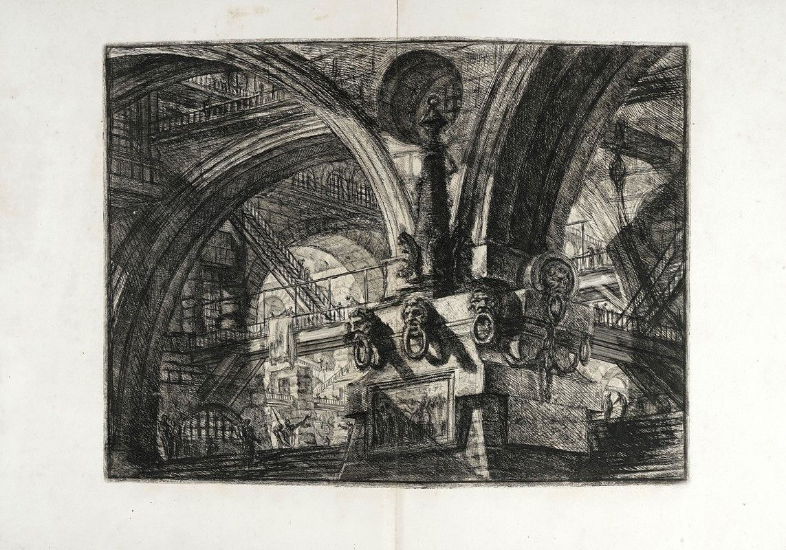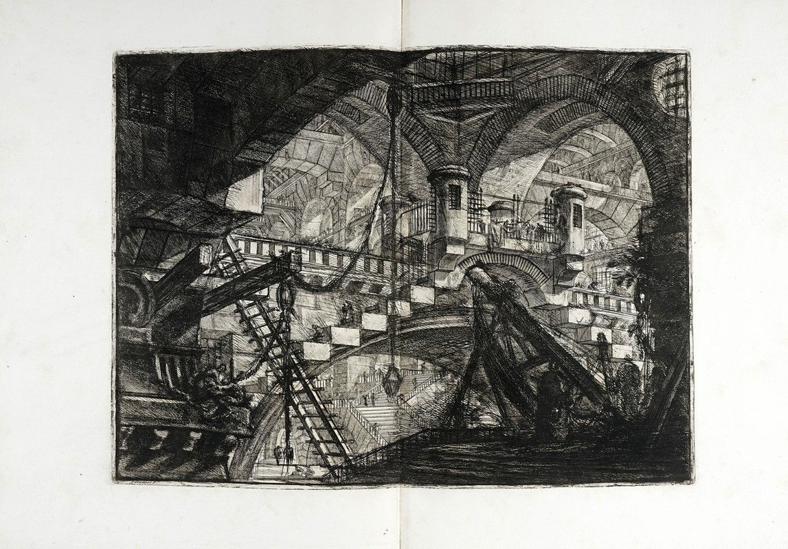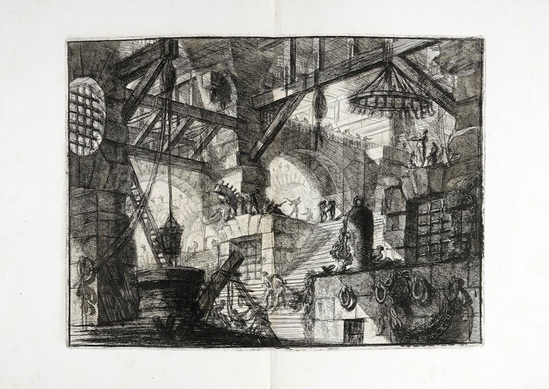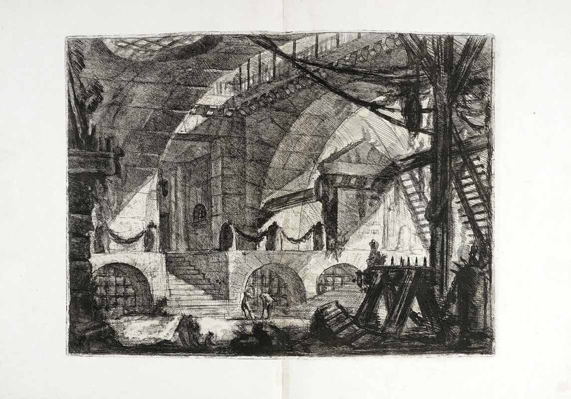 In-folio grande (mm 550x410). Frontespizio e 15 tavole incise all'acquaforte, bulino, morsura aperta, brunitoio, raschietto. mm 540/565x412/420. Foglio: mm 765x540/542. Tavole rilegate con brachetta cartacea al centro nell'ordine seguente: Frontespizio. Hind, 1. Robison, 29. V/IX; L’uomo sulla cremagliera. Hind, 2. Robison, 43. II/VI; La torre rotonda. Hind, 3. Robison, 30. II/VI; La piazza grande. Hind, 4. Robison, 31. II/VI; Il bassorilievo con i leoni. Hind, 5. Robison, 44. I/III; Il fuoco fumante. Hind, 6. Robison, 32. II/VII; Il ponte levatoio. Hind, 7. Robison, 33. II/VI; La scalinata con i trofei. Hind, 8. Robison, 34. II/VI; La ruota gigante. Hind, 9. Robison, 35. IV/VIII; Prigionieri su una piattaforma sporgente. Hind, 10. Robison, 36. II/VI; L’arco con ornamento a conchiglia. Hind, 11. Robison, 37. III/VII; Il cavalletto. Hind, 12. Robison, 38. III/VI; L’arco gotico. Hind, 14. Robison, 40. III/VI; Il molo con la lampada. Hind, 15. Robison, 41. III/VII; Il pozzo. Hind, 13. Robison, 39. II/VI; Il molo con le catene. Hind, 16. Robison, 42. II/VI con il numero XVI all’angolo in basso a destra. Esemplare in II edizione dopo l'aggiunta della firma al margine inferiore di ogni tavola ma prima della numerazione romana all'angolo in alto. Splendide prove di grande freschezza stampate con inchiostrazione piena su carta vergellata spessa con filigrana fiore di giglio in doppio cerchio con lettere B e V (Robison, 32, 1756-1761, come segnalato per questa edizione) visibile su gran parte dei fogli. Legatura moderna in carta decorata di colore viola, al piatto anteriore etichetta per il titolo in pelle nera con impressioni in oro, tagli di testa dorati. Al contropiatto etichetta di provenienza della libreria antiquaria Carl Ewald Rappaport di Roma.