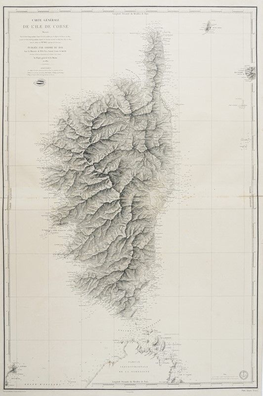 Litografia. mm 920x615. Foglio: mm 975x650. Dettagliata carta nautica della Corsica con a sud l'Isola dell'Asinara e parte della Sardegna con le Bocche di Bonifacio, a nord sulla destra l'Isola di Capraia, un'estremità dell'Isola d'Elba e Pianosa. Bella mappa topografica e idrografica redatta dopo i rilievi eseguiti nel 1820, 1821, 1822 e 1824 sotto la revisione del capitano di vascello Hell.