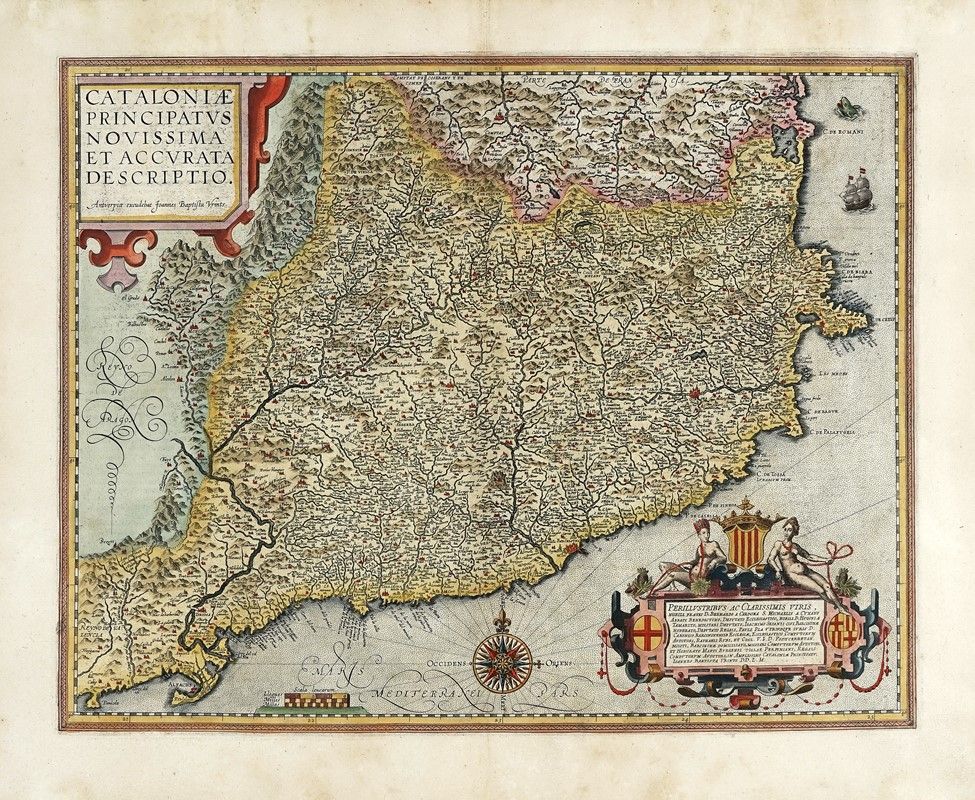 Incisione in rame in coloritura. mm 387x490. Foglio: mm 470x577. Testo latino al verso. Titolo in alto a sinistra entro tabella quadrata. Mappa della Catalogna preparata da Johannes Baptista Vrients per integrare l'edizione postuma del Theatrum Orbis Terrarum di Abraham Ortelius. Viene descritta la costa del Mediterraneo catalano dal fiume Ebro fino alla Francia. In evidenza Barcellona, con il Montserrat e le sue formazioni rocciose, poi con numerosissimi dettagli la descrizione si estende fino ai confini dell'Aragona e della Francia. A Nord la catena dei Pirenei. Nello specchio di mare un mostro marino, un veliero, in basso una rosa dei venti e a destra un grande cartiglio decorativo con dediche a personalità ecclesiastiche e militari, la bandiera catalana e le armi di Barcellona.