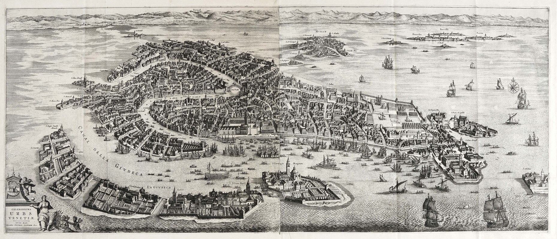 Acquaforte su due lastre. mm 415x1020. Foglio: mm 470x1110. Suggestiva veduta a volo d'uccello di Venezia, pubblicata per la prima volta da Jan Jansson nel 1657. Van der Aa apportò modifiche aggiungendo un nuovo cartiglio per il titolo in basso a sinistra con il leone di San Marco, una figura femminile allegorica della città di Venezia, e due figure di mori con piccole ali rotonde. La veduta si estende fino a comprendere le vicine isole di Murano, Burano, Torcello e Mazorbo. Rappresentati con minuti dettagli i singoli edifici, la laguna, i canali percorsi da gondole e il Bucintoro in processione nel canale della Giudecca. Bellissima prova stampata con inchiostrazione brillante e grande evidenza di segno, su due fogli uniti di carta vergellata.