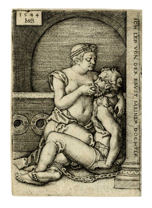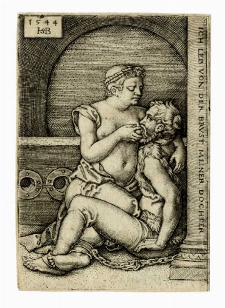 Bulino. mm 72x49. Bartsch, VIII, 75. Hollstein, 82. Con il monogramma e la data "1544" nella tabella in alto a sinistra. Copia in controparte dal bulino di Barthel Beham datato "1525" (New Hollstein, 19). Bellissima impressione nel III stato di 3 dopo la comparsa dell'iscrizione sulla colonna e la cancellazione del nome "Czinmom" in basso, su carta vergellata sottile. Al verso marchio della collezione Alessandro Castagnari (Lugt, 86a), marchio della collezione Antonio Cesare Poggi (Lugt, 617) e altro piccolo marchio probabilmente con lettera "I" o lettera "F" non completamente leggibile.