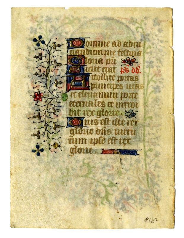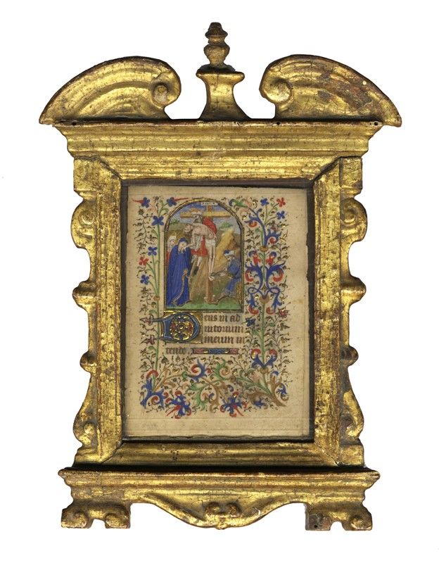 Tempera a colori e oro su pergamena. mm 108x79. Miniatura raffigurante la discesa dalla croce secondo l'episodio, narrato nei vangeli, con Giuseppe di Arimatea e Nicodemo intenti a scendere il corpo di Cristo (Giovanni 19,38-42) e la Vergine e la Maddalena a lato della croce. L'immagine è circondata da un bordo foliato con fiori rossi, blu e rosa con steli verdi; oltre foglie d'acanto blu e oro. Un'iniziale miniata su tripla riga (la lettera “D”) in oro brunito e blu con dettagli in rosso. Il testo "Deus in adiutorium meum intende", in caratteri gotici latini marrone dorato, è tratto dal primo verso del Salmo 70 (Salmo 69 nella Vulgata) e costituisce la preghiera introduttiva a tutte le Ore dei Breviari romani, ambrosiani e monastici. Al verso testo dal Salmo XXIII (versi 7-9) in gotico latino su 13 righe con iniziali miniate in oro brunito ("D,G,S,A,Q") e testo in marrone dorato: "Domine, ad adiuvandum me festina / Gloria pri [Patri]/Sicut erat [in principio, et nunc et semper] / Attollite portas, principes, vestras, et elevamini portae aeternales et introibit Rex gloriae / Quis est iste Rex gloriae Dns [Dominus] virtutum ipse est Rex gloriae."