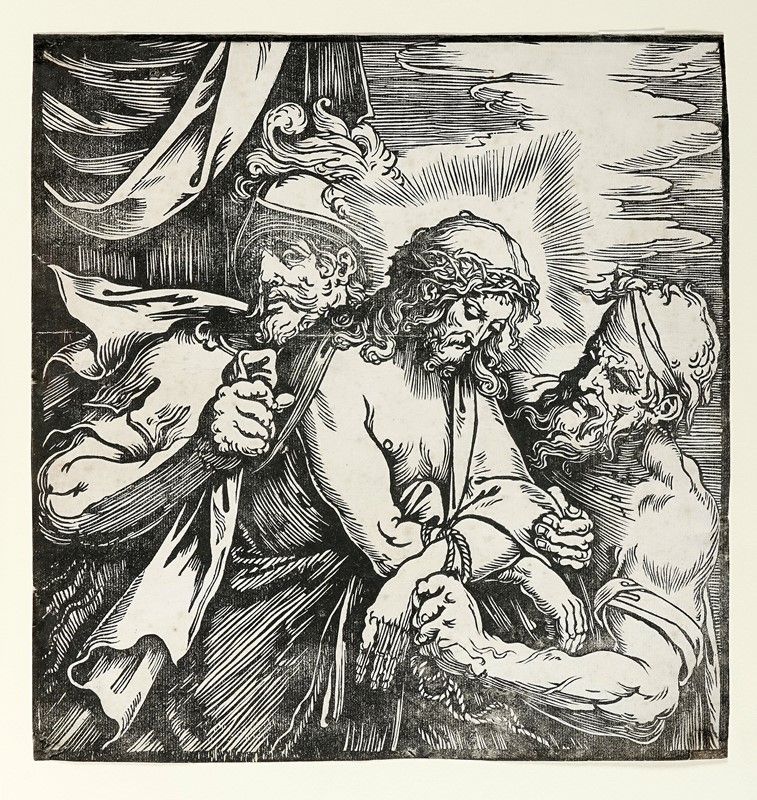 Xilografia in blocco unico. mm 349x325. Muraro/Rosand, 109. Vigorosa composizione un tempo ritenuta derivante da un disegno di Tiziano e attribuita a Domenico dalle Greche (Baseggio, 6), restituita poi da Muraro e Rosand alla maturità artistica di Giuseppe Scolari. Bellissima prova di questo raro intaglio stampata con bel gauffrage al verso su carta vergellata con filigrana "lettere PG".