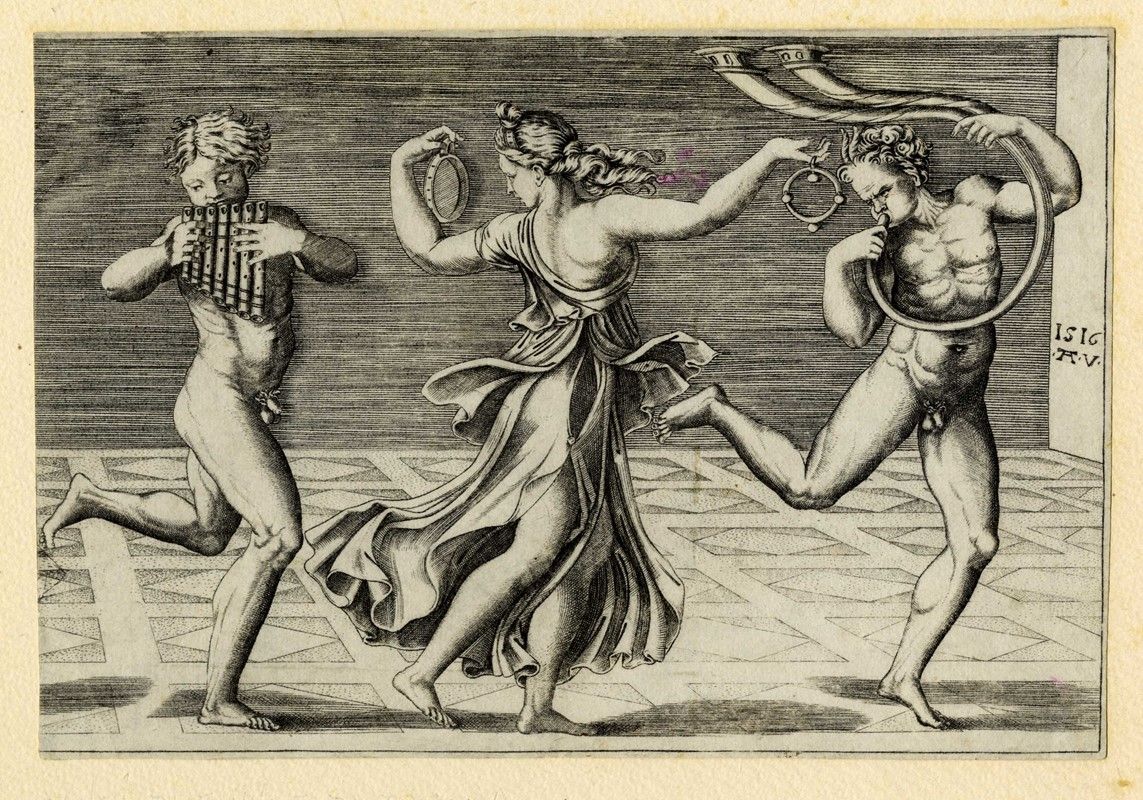 Bulino. mm 176x258. Bartsch, XIV, 250. Raphael invenit (Mito, IIII), 1. Con il monogramma e la data "1516" sul lato destro del foglio. Verosimilmente da un disegno attribuito a Giulio Romano conservato all'Albertina (inv. 217). Ottima prova in II stato di due dopo la divisione della lastra (esemplare completo TIB, Vol. 26, p. 248 con sulla sinistra altre due baccanti e fauno danzanti).
