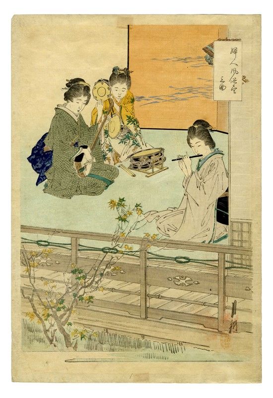 Xilografia a colori (nishiki-e). Formato: ôban verticale (mm 345x240). Firma: Chôkarô Yoshiiku ga. Editore: Hiranoya Shinzô (Aikindô) parzialmente visibile al margine sinistro in basso. Censura: Serpente 3 aratame, parzialmente visibile al margine sinistro in basso. Intagliatore: nessuna indicazione. Data: 1869 (Meiji 2, terzo mese). Serie: Shunshoku sanjûroku kaiseki (I colori della primavera in trentasei ristoranti). SI AGGIUNGONO: Toyohara Chikanobu (Prefettura di Niigata, 1838-Tokyo, 1912). Bellezza dell'era Bunkyu (1861-64). Xilografia a colori (nishiki-e). Formato: ôban verticale (mm 352x230). Firma: Yoshu Chikanobu. Editore: Matsuki Heikichi. Data: 1896. Serie: Jidai Kagami (Specchio delle epoche). Nel riquadro in alto scena con la ricerca delle vongole sulla riva della baia di Shinagawa./ Ogata Gekko (Saemon-cho, Edo 1859 - Ushigome, 1920). Tre strumenti musicali. Xilografia a colori (nishiki-e). Formato: ôban verticale (mm 342x237). Firma: Gekko. Editore: Sasaki Toyokichi. Data: 1891. Serie: Fujin Fuzoku-ga (Usi e costumi delle donne).