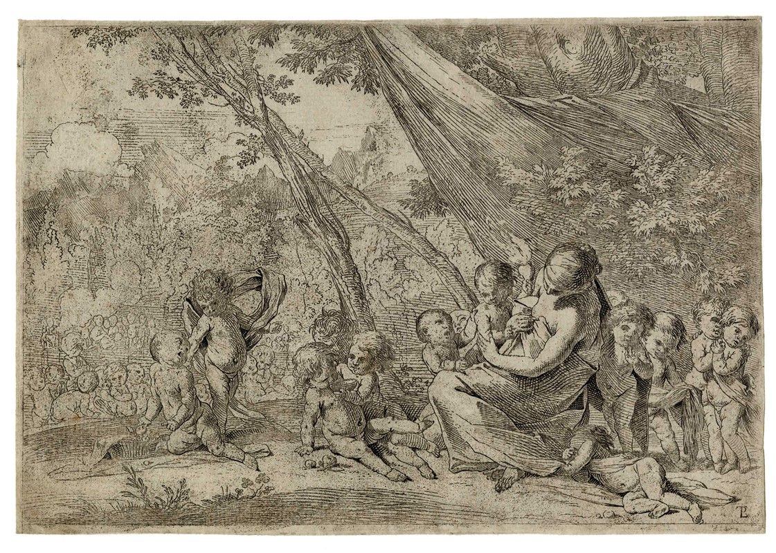 Acquaforte. mm 173x253. Foglio: mm 177x254. Bartsch, XX, 27. Bellini (Testa), 4. Cropper, 9. Sulla lastra in basso a destra il monogramma a lettere sovrapposte. Ottima prova nel I stato di 2 avanti l'excudit di Mariette, stampata su sottile carta vergellata con parte di filigrana "grande stemma coronato con corno da caccia". La critica assegna questa acquaforte al periodo giovanile in virtù di alcune imperfezioni nella morsura e per il segno ancora incerto.