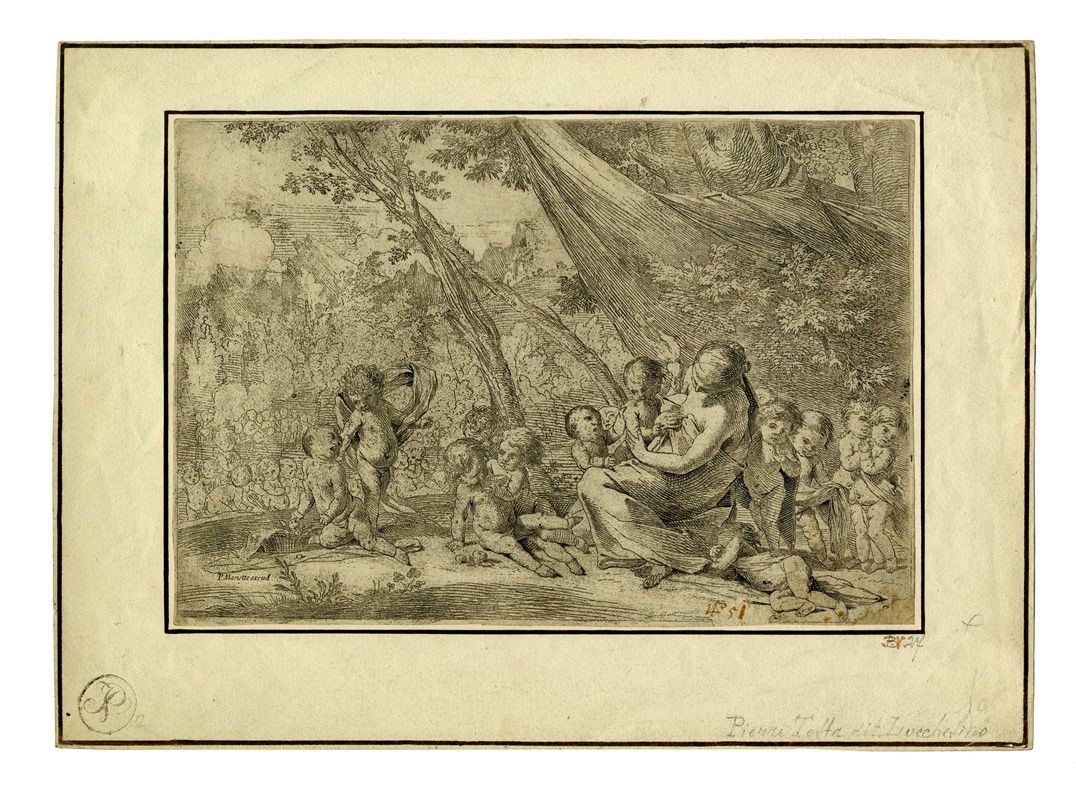 Acquaforte. mm 173x253. Con il montaggio: mm 243x335. Bartsch, XX, 27. Bellini (Testa), 4. Cropper, 9. Sulla lastra in basso a sinistra "P. Mariette excud.". La prova è mancante dell'angolo in basso a destra dove era posizionato il monogramma. Buona prova nell'edizione pubblicata da Pierre Mariette I (Parigi, 1596-1657) dopo che era entrato in possesso della lastra, il rame non si trova per questo depositato presso l'Istituto Nazionale per la Grafica di Roma. La critica assegna questa acquaforte al periodo giovanile in virtù di alcune imperfezioni nella morsura e per il segno ancora incerto.
