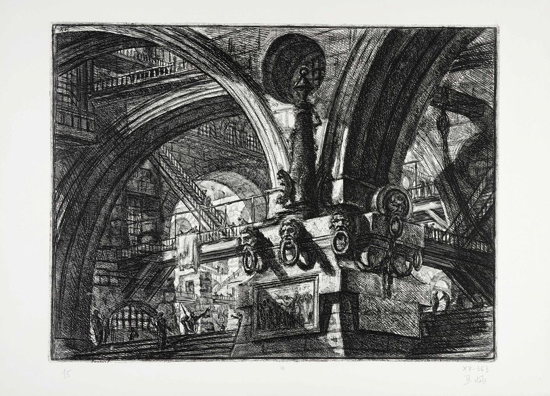 Acquaforte, bulino, puntasecca, morsura aperta, brunitoio. mm 400x545. Foglio: mm 495x700. Hind, 15. Robison, 41. Da Carceri d'invenzione, VII stato di 7 dalla VI e definitiva edizione, in tiratura moderna impressa su carta calcografica pesante Fedrigoni Fabriano.