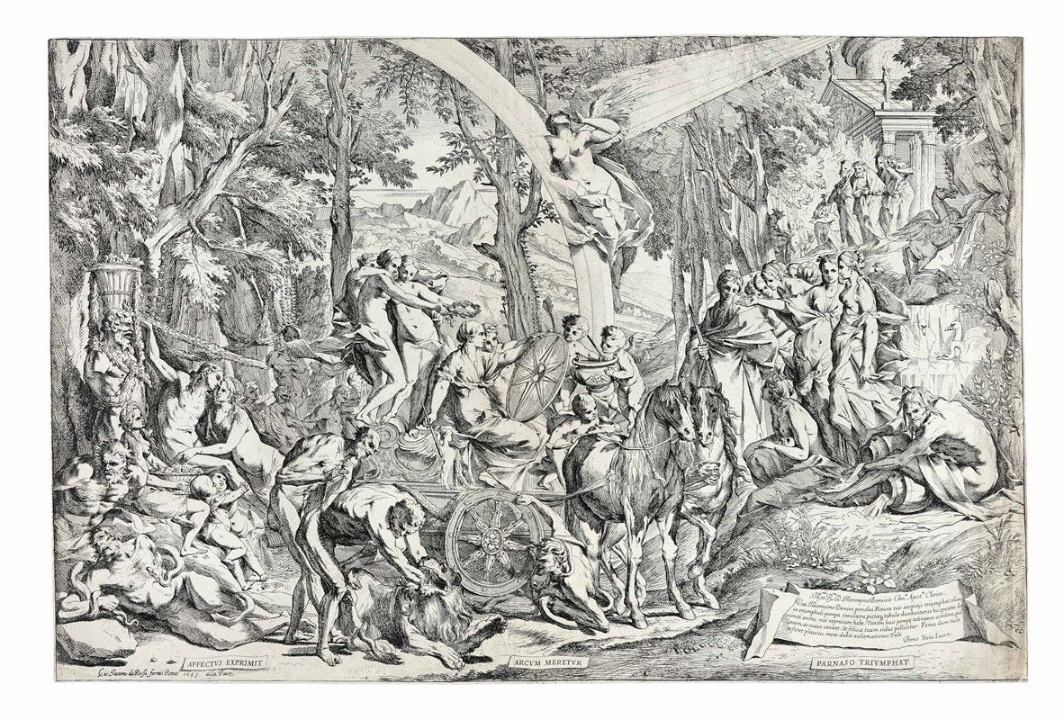 Acquaforte. mm 474x717. Bartsch, XX, 35. Bellini (Testa), 29. Cropper, 73. In basso nella composizione tre piccoli cartiglii con le iscrizioni "AFFECTUS EXPRIMIT", "ARCUM MERETUR", "PARNASO TRIUMPHAT", nell cartiglio più grande in basso a destra la dedica a Gerolamo Buonvisi. Bellissima e brillante impressione nel II stato di 2 dopo la comparsa dell'indirizzo di Giovan Giacomo De Rossi e della data "1648". Carta vergellata pesante con filigrana "scudo". SI AGGIUNGE: Id., Id., Acquaforte. mm 480x727. Buona prova nel I stato di 2 avanti l'indirizzo di De Rossi e della data.