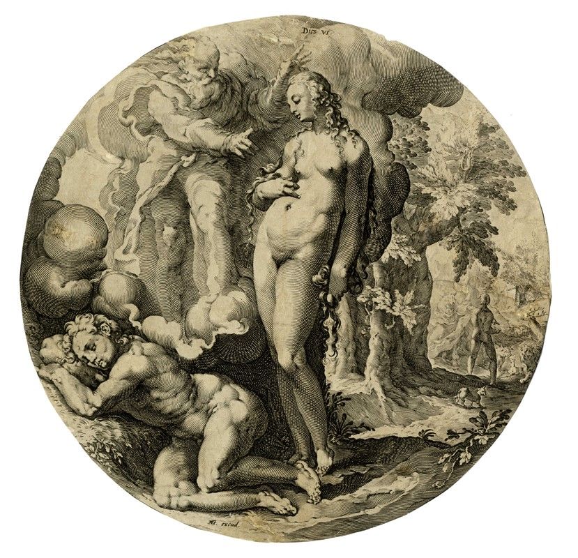 Bulino. Ø mm 263. Bartsch, III, 41. New Hollstein (Dutch & Flemish), 41. Con l'excudit di Goltzius in lastra sul lato sinistro. Da La creazione del mondo serie in sette tavole incisa da Jan Muller (New Hollstein, 35-41) su disegni di Hendrick Goltzius (New Hollstein, 381-387). Ottima prova nel III stato di 3 impressa su carta vergellata lievemente spessa priva di filigrana.