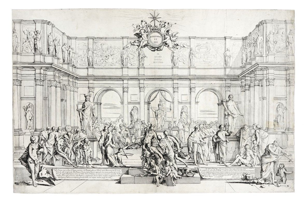 Acquaforte. mm 471x729. Foglio: mm 475x739. Bartsch, XX, 34. Bellini (Testa), 20. Cropper, 41. In alto al centro il titolo e il motto sormontato dalla stella a otto punto dei Buonvisi. In basso a destra dedica a Gerolamo Buonvisi firmata dall'artista, e più in basso sulla pietra il monogramma "PTL" a lettere interlacciate. Bellissima prova nel I stato di 3, avanti l'indirizzo di De Rossi e i segni aggiuntivi sulla scritta nel cartiglio a destra,stampata con segno pieno e brillante su carta vergellata con filigrana "agnello di Dio in doppio cerchio" (Fabriano, fine XVI secolo). Il tema allude alla formazione del vero artista che per divenire tale deve commisurare teoria e pratica. Nel cartiglio a sinistra si legge "La Teoria è per se stessa di legami avvinta, e la Pratica nella sua libertà è per se stessa cieca". Alle estremità della composizione sul primo piano si trovano le rispettive personificazioni, la Teoria ha un compasso sulla testa, a indicare che trae le sue conclusioni da principi universali, ma le sue mani sono legate e i suoi libri giacciono a terra. La pratica è cieca e inciampa tra rocce e rovi, accompagnata da una scimmia con la ciotola per l'elemosina che rappresenta quegli artisti imitativi versati solo nella pratica che devono elemosinare tutto ciò di cui hanno bisogno dagli altri.