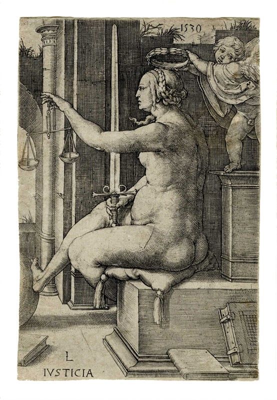 Bulino. mm 160x107. Bartsch, VII, 131. New Hollstein, 131. Con il monogramma e il titolo sulla lastra in basso a sinistra e la data "1530" in alto. Da Le Virtù, serie in sette tavole delle quali due (Giustizia e Prudenza) recano la data "1530". Ottima impressione nel I stato di 3 su carta vergellata sottile priva di filigrana.