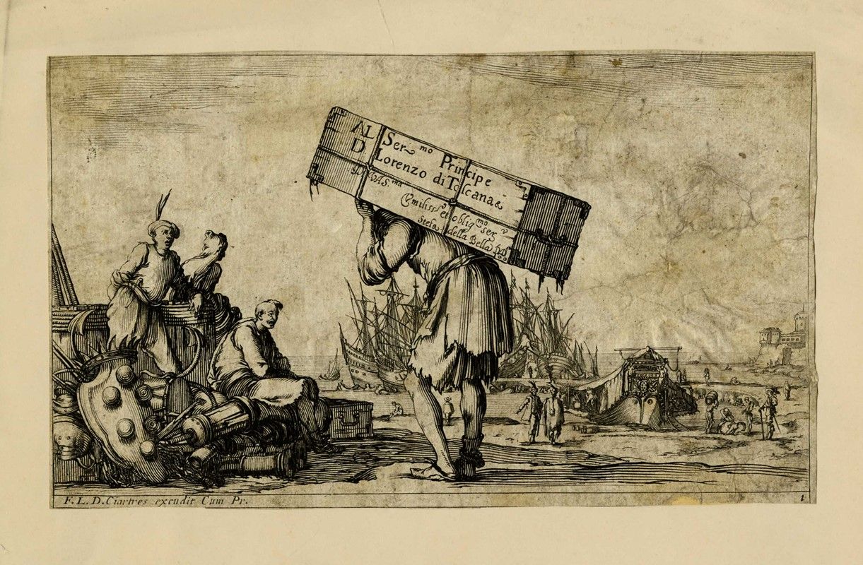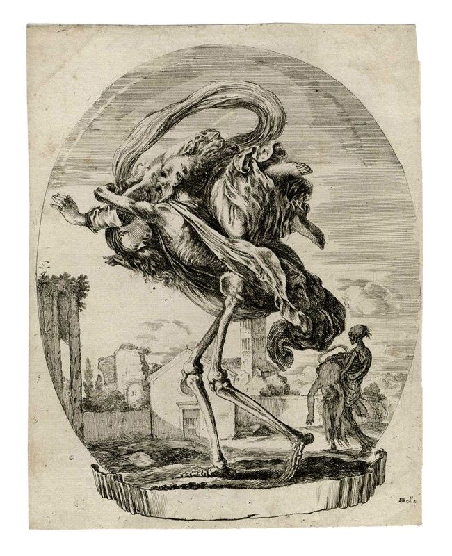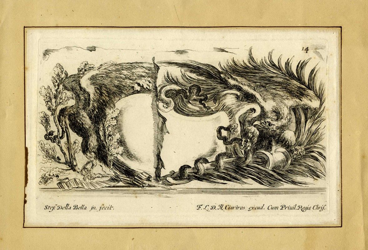 Acquaforte e bulino. mm 188x145. DeVesme/Massar, 90. In basso a destra "SDBella" a iniziali interlacciate. Da Le cinque morti, serie eseguita tra il 1645 e il 1661. Bellissima impressione nel III stato di 4, dopo i tratti a bulino ma prima dell'indirizzo di Vincent, stampata con segno pieno e nitido su carta vergellata lievemente spessa priva di filigrana. SI AGGIUNGONO: Id., Caccia al cinghiale. Acquaforte. mm 150x236. DeVesme/Massar, 733. Al margine in basso a destra a puntasecca "S.D.Bella". Da Cacce a diversi animali, serie in nove tavole databile al 1654. Ottima prova nell'unico stato impressa su carta vergellata con filigrana "tre mezzelune". / Id., Cartiglio con aquile e serpenti. Acquaforte. mm 115x195. Con montaggio: mm 180x258. DeVesme/Massar, 1040. Firmata in basso a sinistra. Dalla serie in diciotto tavole Raccolta di varii cappriccii et nove inventioni di cartelle... Buona prova nel II stato di 3 prima dell'indirizzo di Mariette su carta non vergellata. / François Collignon da Stefano Della Bella. Frontespizio da Serie di otto marine, serie eseguita nel 1634 e dedicata al principe Don Lorenzo di Toscana. Acquaforte. mm 123x217. DeVesme/Massar, 810.