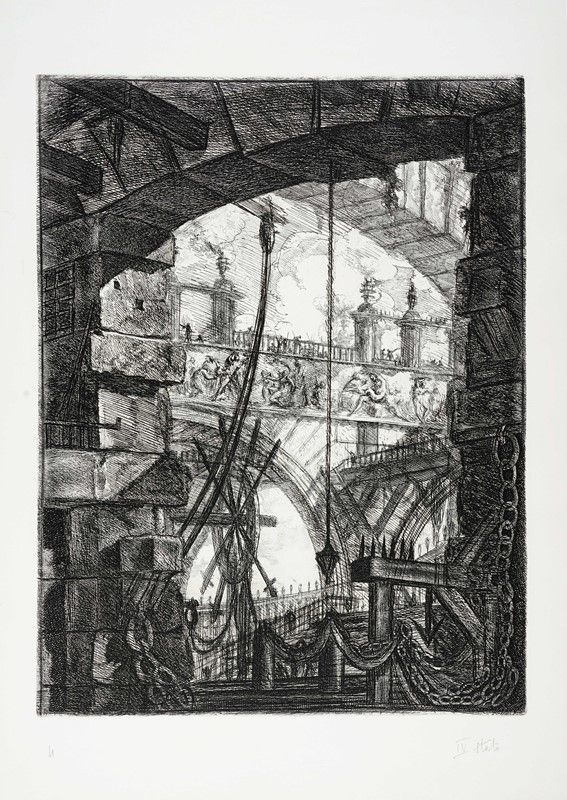 Acquaforte, bulino, puntasecca, morsura aperta, brunitoio. mm 545x417. Foglio: mm 700x495. Hind, 4. Robison, 31. Da Carceri d'invenzione, VI stato di 6 dalla VI e definitiva edizione, in tiratura moderna impressa su carta calcografica pesante Fedrigoni Fabriano.
