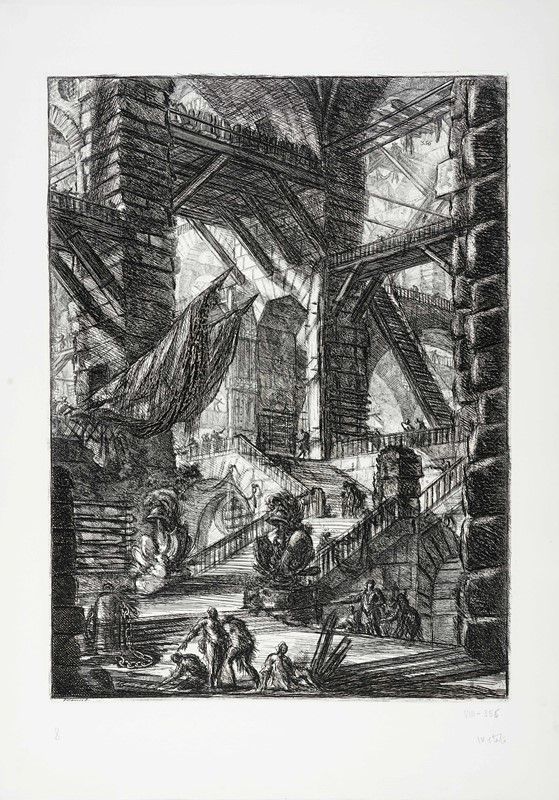 Acquaforte, bulino, puntasecca, morsura aperta, brunitoio. mm 545x417. Foglio: mm 700x495. Hind, 8. Robison, 34. Da Carceri d'invenzione, VI stato di 6 dalla VI e definitiva edizione, in tiratura moderna impressa su carta calcografica pesante Fedrigoni Fabriano.