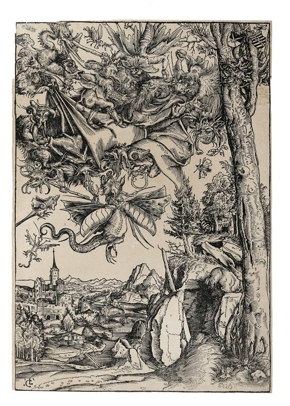 Xilografia. mm 409x280. Bartsch, VII, 56. Hollstein, 76. Con il monogramma e la data 1506 sulla matrice in basso a sinistra. Bellissima prova nel II stato di 2 su sottile carta vergellata con filigrana grappolo d'uva e contromarca cartiglio con lettera. In alto a destra le armi di Sassonia, omaggio alla casata del suo protettore Federico III di Sassonia, detto il Saggio (Torgau,1463 – Lochau, 1525), principe elettore (della Casata di Wettin) dal 1486 fino alla sua morte.