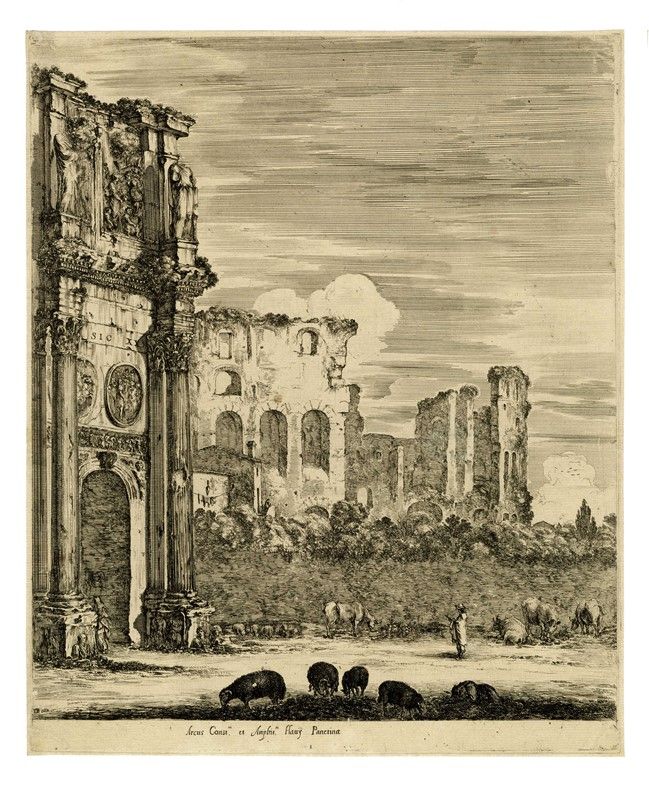 Acquaforte. mm 320x267. Foglio: mm 324x275. DeVesme/Massar, 834. Dalla serie Sei grandi vedute, quattro di Roma e due della campagna romana. Bellissima impressione nel II stato di 2 dopo la comparsa della lettera al margine inferiore, su carta vergellata sottile con filigrana "IHS e croce latina" (Nome di Gesù). SI AGGIUNGONO: Id., Marinaio bianco seduto e altro moro in piedi. Acquaforte e lavis. mm 190x185. Foglio: mm 230x325. DeVesme/Massar, 201. Bellissima prova nel I stato di 2 impressa con marcato e diffuso effetto di lavis su carta vergellata sottile con filigrana "tre mezzelune". / Id., Cavaliere moro porge del fieno a un cavallo. Acquaforte e lavis. mm 84x117. DeVesme/Massar, 283. In alto a destra "S.D.B: in". Bellissima prova impressa con diffuso effetto di lavis su carta vergellata con parte di contromarca "lettera C". / Id., Quattro cavalieri turchi a mezzo busto con turbante. Acquaforte e lavis. mm 78x145. Foglio: mm 103x164. DeVesme/Massar, 285. Ottima prova nel II stato di 2 impressa con diffuso effetto di lavis su carta vergellata priva di filigrana. / Id:, Tre cavalieri ungheresi a mezzo busto. Acquaforte e lavis. mm 72x108. Foglio: mm 97x136. DeVesme/Massar, 288. Bella prova impressa con tracce di lavis su carta vergellata sottile priva di filigrana.
