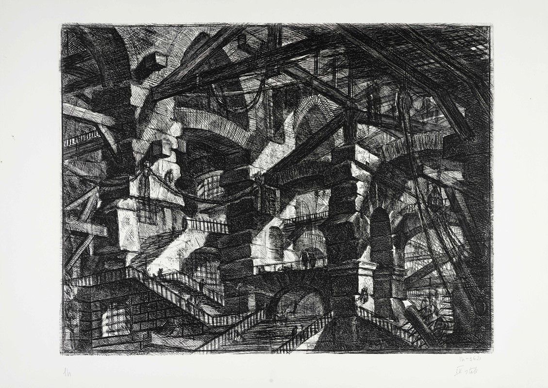 Acquaforte, bulino, puntasecca, morsura aperta, brunitoio. mm 400x545. Foglio: mm 495x700. Hind, 14. Robison, 40. Da Carceri d'invenzione, VI stato di 6 dalla VI e definitiva edizione, in tiratura moderna impressa su carta calcografica pesante Fedrigoni Fabriano.