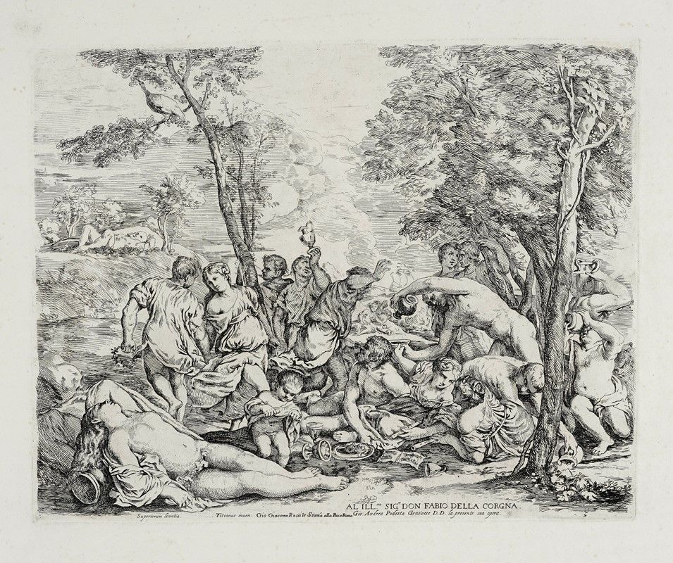 Acquaforte. mm 310x392. Foglio: mm 417x518. Bartsch, 7. TIB (Commentary).005 S2. In controparte dal Baccanale degli Andrii di Tiziano. Con la firma in basso al centro sotto la dedica a Don Fabio della Corgna. Bellissima prova, stampata con segno nitido e brillante, su carta lievemente spessa non vergellata con filigrana "P.M.".