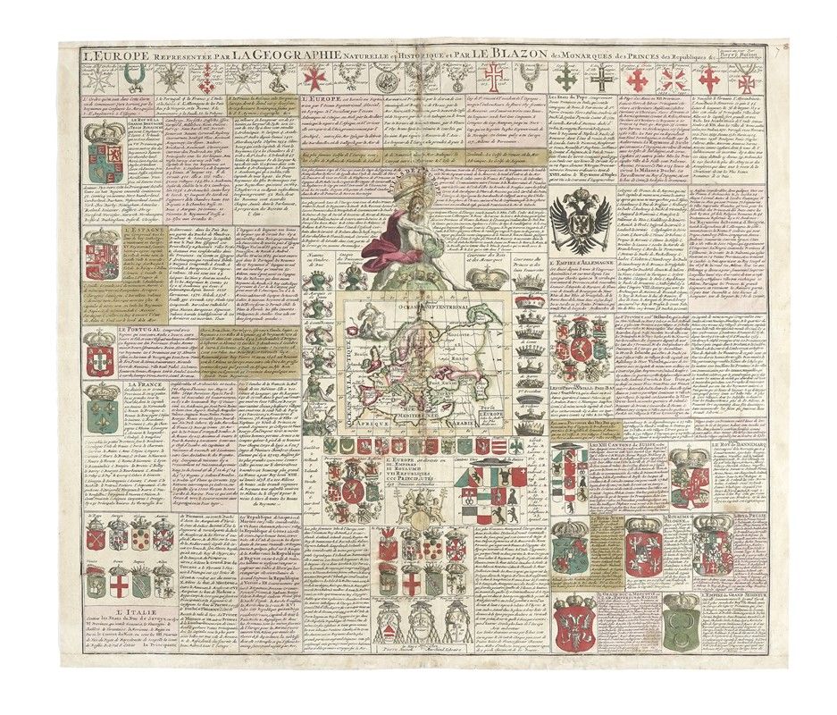 Acquaforte in coloritura. mm 500x565. Foglio: mm 513x598. Grande foglio di testo inciso con una mappa dell'Europa al centro sormontata da una figura di atlante, all'interno del foglio trovano posto le illustrazioni dei blasoni dei reali europei, delle repubbliche, degli ordini ecclesiastici e degli ordini cavallereschi, e emblemi araldici. Da Jean de Beaurain, Atlas geographique, Contenant les Hémisphéres célestes et terrestres ; les Cartes marines du grand Océan ; la Carte générale d'Europe, divisée en ses Etats ; celles des Côtes de la Mer méditerranée, et des Iles Britanniques. Tome I. A Paris, 1749.