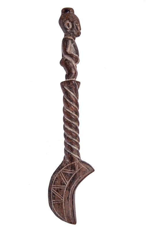 Legno intagliato. cm 35x8x3. Martello rituale Agni dove l'impugnatura è scolpita per rappresentare un uomo, mentre il collo dell'oggetto è lavorato a spirale.