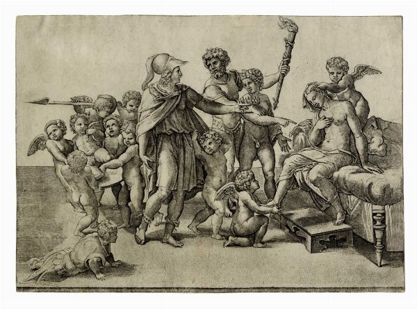Bulino. mm 222x313. Bartsch, XV, 62. Raphael invenit (altri affreschi) X, 1. Episodio tratto dal dialogo di Luciano Herodotus sive Action e affrescato in una delle sale del Casino Olgiati, un tempo situato nell’area dell’attuale galoppatoio nella Villa Borghese, acquistato dai Borghese nel 1831 e distrutto nel 1849. Attribuito a Girolamo Siciolante da Sermoneta e datato tra il 1556 e il 1560, è oggi conservato alla Galleria Borghese (inv. 303). Bellissima impressione, nell'unico stato, stampata con tonalità su carta vergellata sottile con filigrana "ancora in cerchio singolo" (Woodward, 167-169, 1543-1568).