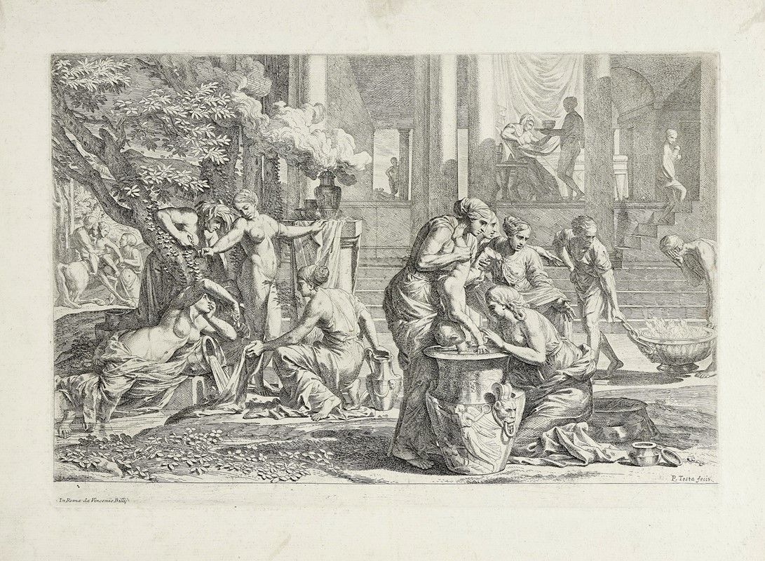 Acquaforte e puntasecca. mm 280x416. Foglio: mm 375x510. Bartsch, XX, 21. Bellini (Testa), 36. Cropper, 118. Sulla lastra in basso a destra "P. Testa fecit". Al margine inferiore a sinistra l'indirizzo di Vincenzo Billy. Bellissima prova nel III stato di 4 dopo la sostituzione dell'indirizzo di Van westerhout. con quello di Billy. Carta vergellata pesante con filigrana "fiore di giglio in cerchio singolo".