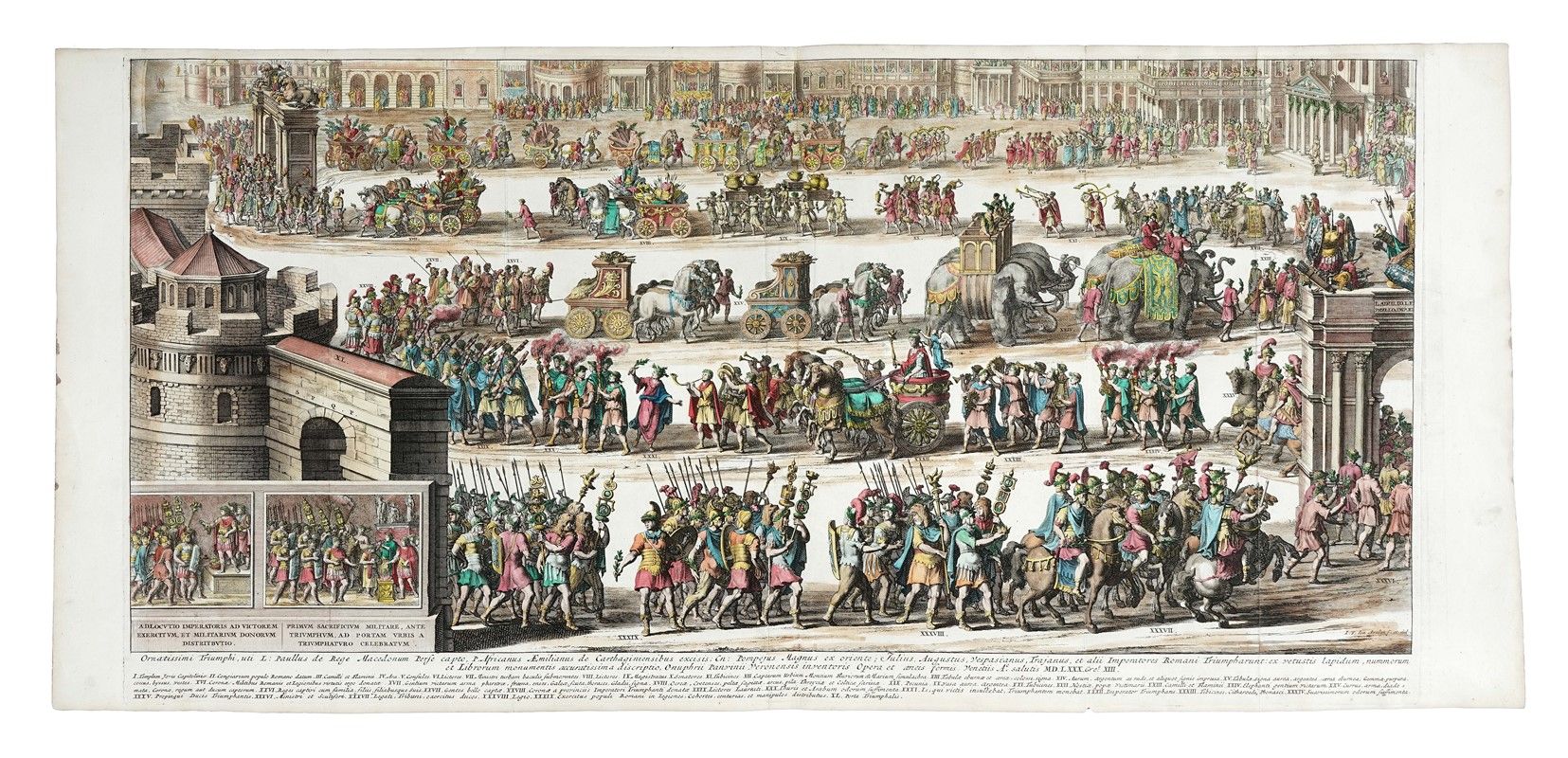 Acquaforte e bulino in coloritura. mm 384x760. Foglio: mm 390x810. Firmata sulla lastra in basso a destra "I.V. den Aveelen f. et del.". Grande stampa decorativa a fregio ispirata alle tavole di corredo al Comentario dell'vso, et ordine de' trionfi antichi. Di fra Onofrio Panuinio dell'Ordine heremitano, In Venetia: appresso Michele Tramezzino, 1571.
