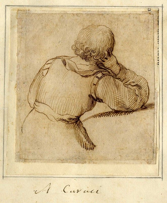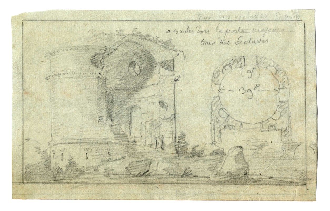 Penna e inchiostro bruno su carta vergellata color nocciola. mm 373x105. Foglio applicato a pieno a supporto in carta vergellata pesante. Con il supporto: mm 403x120. SI AGGIUNGE: Scuola francese XVIII secolo. Tour des esclaves. Matita di grafite su carta vergellata sottile bianca. In alto a destra iscrizione a matita "tour des Esclaves". mm 94x150. Il piccolo foglio raffigura il mausoleo e la pianta dell'aula ottagonale che si trova lungo Via Prenestina presso la Villa Gordiani: il nome è dovuto probabilmente al fatto che tale rudere a fine Cinquecento appartenne a Vincenzo Rossi dello Schiavo.