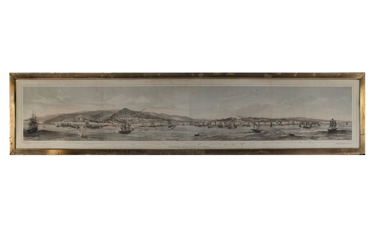 Litografia a colori. mm 350x2020. Foglio: mm 405x2090. In basso a sinistra "A. Cuvillier & J.Jacottet Lith.", titolo e legenda dei luoghi in calce al margine inferiore. Raro panorama di Trieste in due parti. La veduta comprende tutto il golfo da Punta Grignano a sinistra, passando per monte S. Severo, il molo del sale, fino alla Torre del Fanale e Pirano a destra.