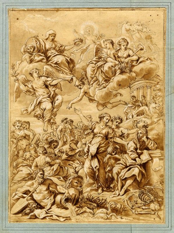 Penna e inchiostro bruno, pennello e acquerello marrone, matita di grafite, minimi rialzi in bianco. Carta vergellata pesante apparentemente priva di filigrana. mm 332x243. In basso al centro marchio a secco del collezionista danese Benjamin Wolff (Engelholm, Naestvad,1790–1866) (Lugt, 420). Applicato in alto a vecchio supporto in cartoncino azzurro con filetti a penna e inchiostro nero. Con il supporto mm 447x340. Affollata allegoria con in alto a sinistra la Fama, divinità olimpie in cielo, sul fondo Dante e Virgilio e Pegaso, sul primo piano le muse e a destra il poeta seduto, in basso divinità fluviale e memento mori.