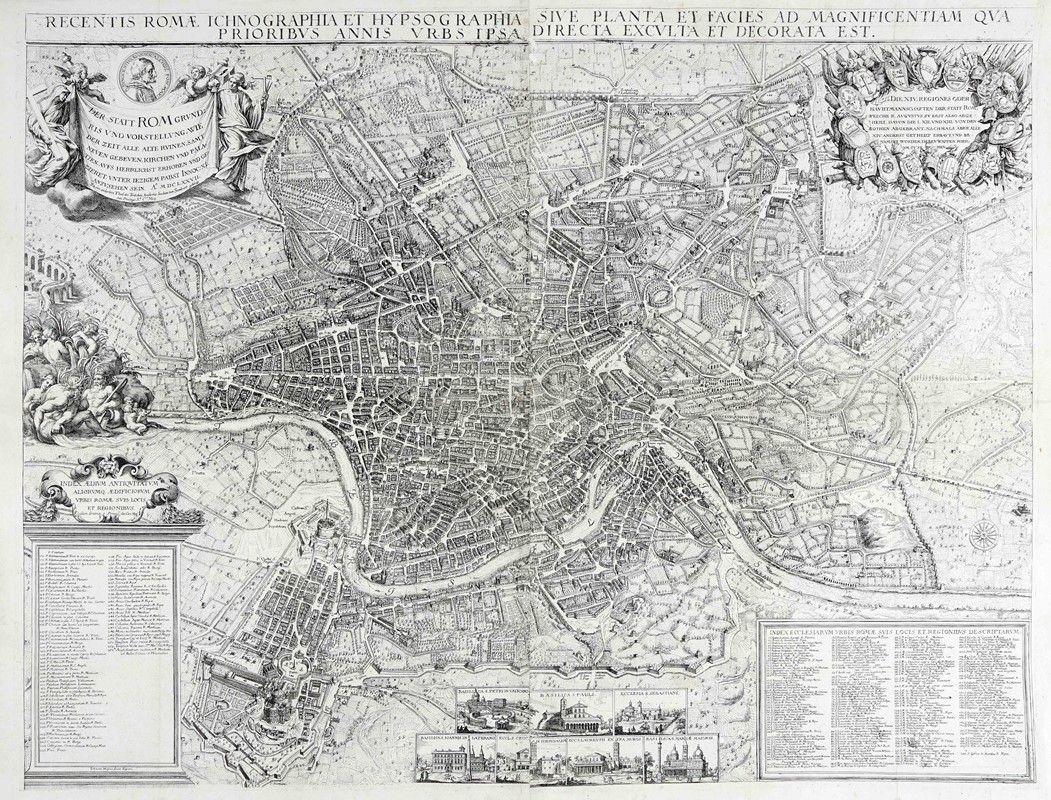 Acquaforte e bulino, su due lastre. mm 645x855. Foglio: mm 673x908. Veduta panoramica di Roma, basata sulla Nuova Pianta et alzata della città di Roma in 12 fogli di Giovanni Battista Falda, pubblicata per la prima volta nel 1676. La mappa abbraccia tutta la città entro le antiche Mura Aureliane. Si osservano numerosi monumenti e siti, il Colosseo, il Pantheon, Piazza del Popolo, la Chiesa di San Giovanni in Laterano, le Terme di Diocleziano e il Vaticano con la Cupola della Basilica di San Pietro, Castel Sant'Angelo e il grande colonnato ovale che fiancheggia la piazza di fronte a San Pietro completato solo nel 1666 da Gianlorenzo Bernini. Numerosi i dettagli del paesaggio urbano. In alto a sinistra il cartiglio del titolo è sormontato dal ritratto di Innocenzo XI papa dal 1676 al 1689. Nell'angolo in alto a destra gli emblemi dei 14 rioni tradizionali di Roma e un'allegoria del Tevere. In basso a sinistra la tabella'Index Aedium Antiquitatarum' con l'elenco di 253 antichi edifici e rovine in tutta la città. L'"Index Ecclesiarium" in basso a destra identifica 178 chiese. In basso al centro si trovano sette vedute di alcune delle chiese più importanti della città, tra cui la Basilica di San Pietro (Vaticano), la Basilica di San Paolo, la Chiesa di San Sebastiano, San Giovanni in Laterano, la Chiesa della Santa Croce di Gerusalemme, la Basilica di San Lorenzo Fuori le Mura e la Basilica di Santa Maria Maggiore.