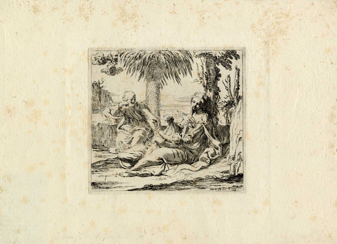 Acquaforte. mm 167x180. Foglio: mm 320x445. Bartsch, XIX, 4. TIB, 42/19, 4. Firmata "Siranus In." sulla lastra in basso a destra. Ottima impressione di questa rara acquaforte nell'unico stato, stampata con bel contrasto e segno nitido su carta vergellata con filigrana "lettere P M in cerchio singolo sormontato da trifoglio" (Bologna, fine XVII secolo).