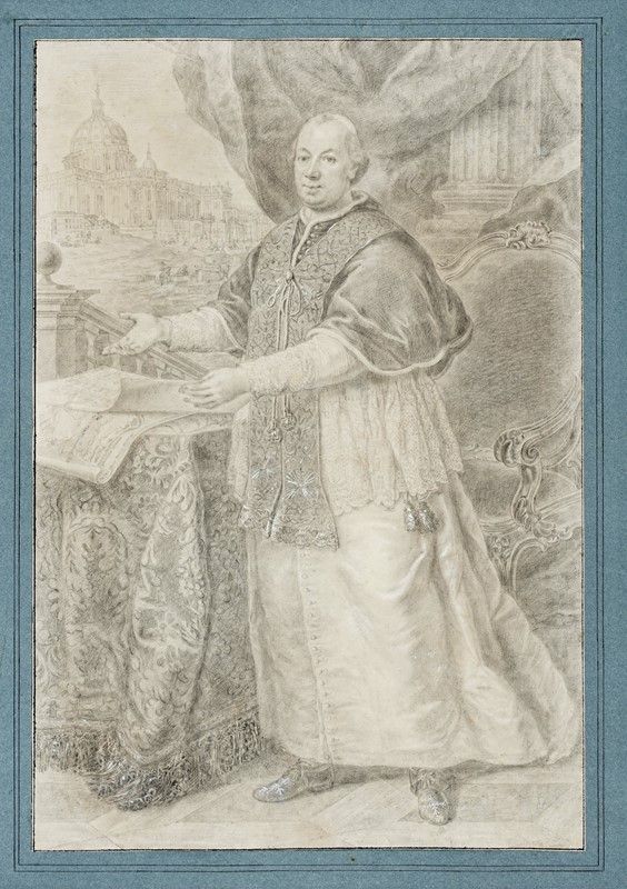 Matita nera, matita di grafite, rialzi in bianco su carta vergellata color avorio. Linea d'inquadramento a penna e inchiostro nero. mm 525x355. Applicato a pieno su vecchio cartoncino azzurro con filetti a penna e inchiostro nero. In basso al centro del supporto marchio a secco del collezionista danese Benjamin Wolff (Engelholm, Naestvad,1790–1866) (Lugt, 420). Con il supporto: mm 645x460. Il disegno è preparatorio per il ritratto di Pio VI (Cesena, 1717- Valence-sur-Rhône, 1799), papa della Chiesa cattolica dal 15 febbraio 1775 fino alla sua morte, conservato al Museo di Roma di Palazzo Braschi (inv. MR1964). Il pontefice è ritratto a figura intera nell'atto di indicare due grandi tavole poggiate su un tavolo: il progetto architettonico relativo alla costruzione della Sagrestia vaticana e la pianta delle paludi pontine.